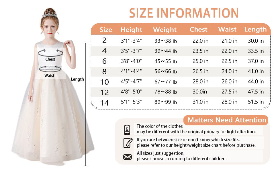 We provide customized dresses,if you are between sizes or do not know which size fits,please provide your girl's height, weight, waist and bust size to us, we can make a fitted dress for your girl.