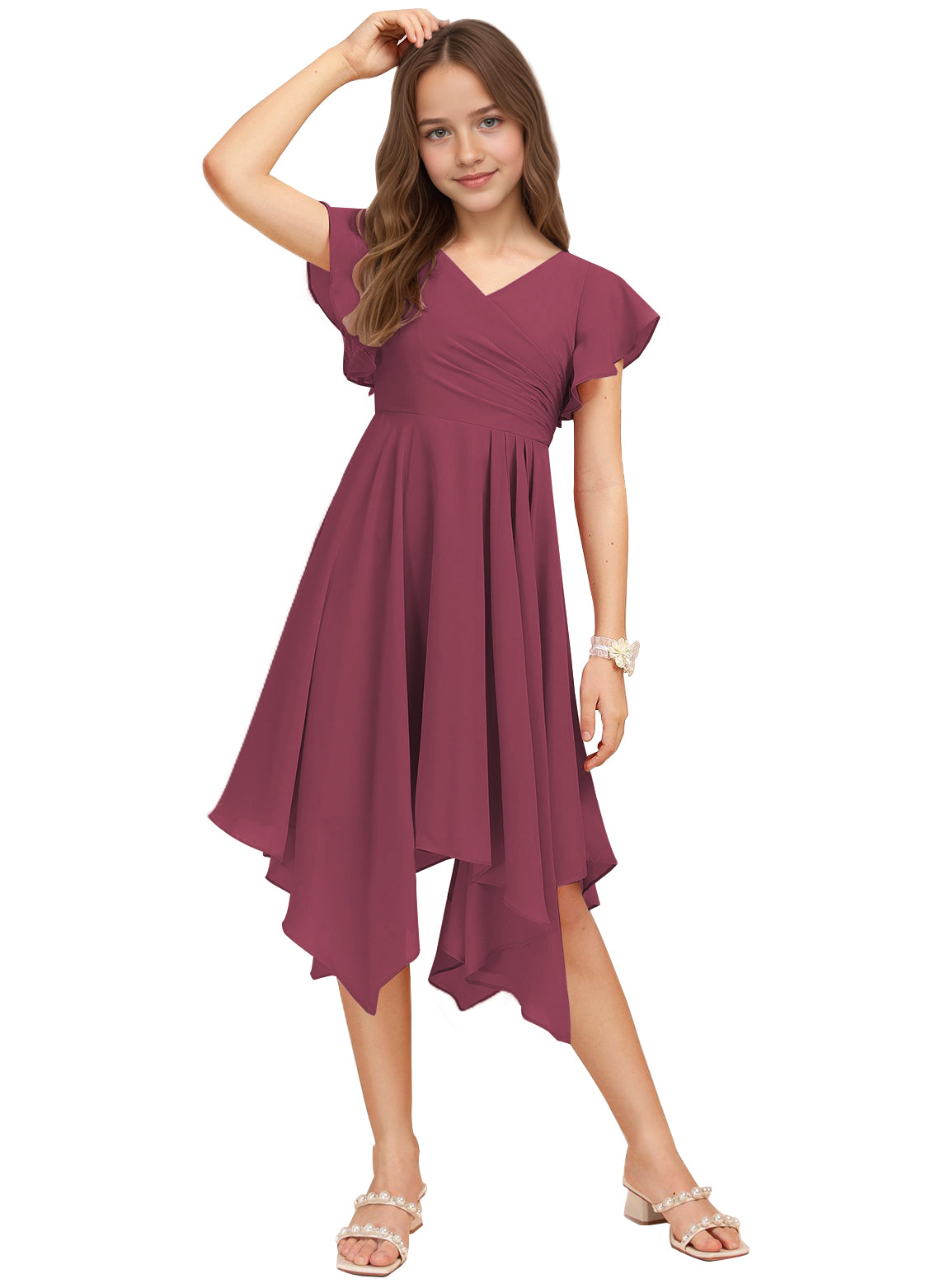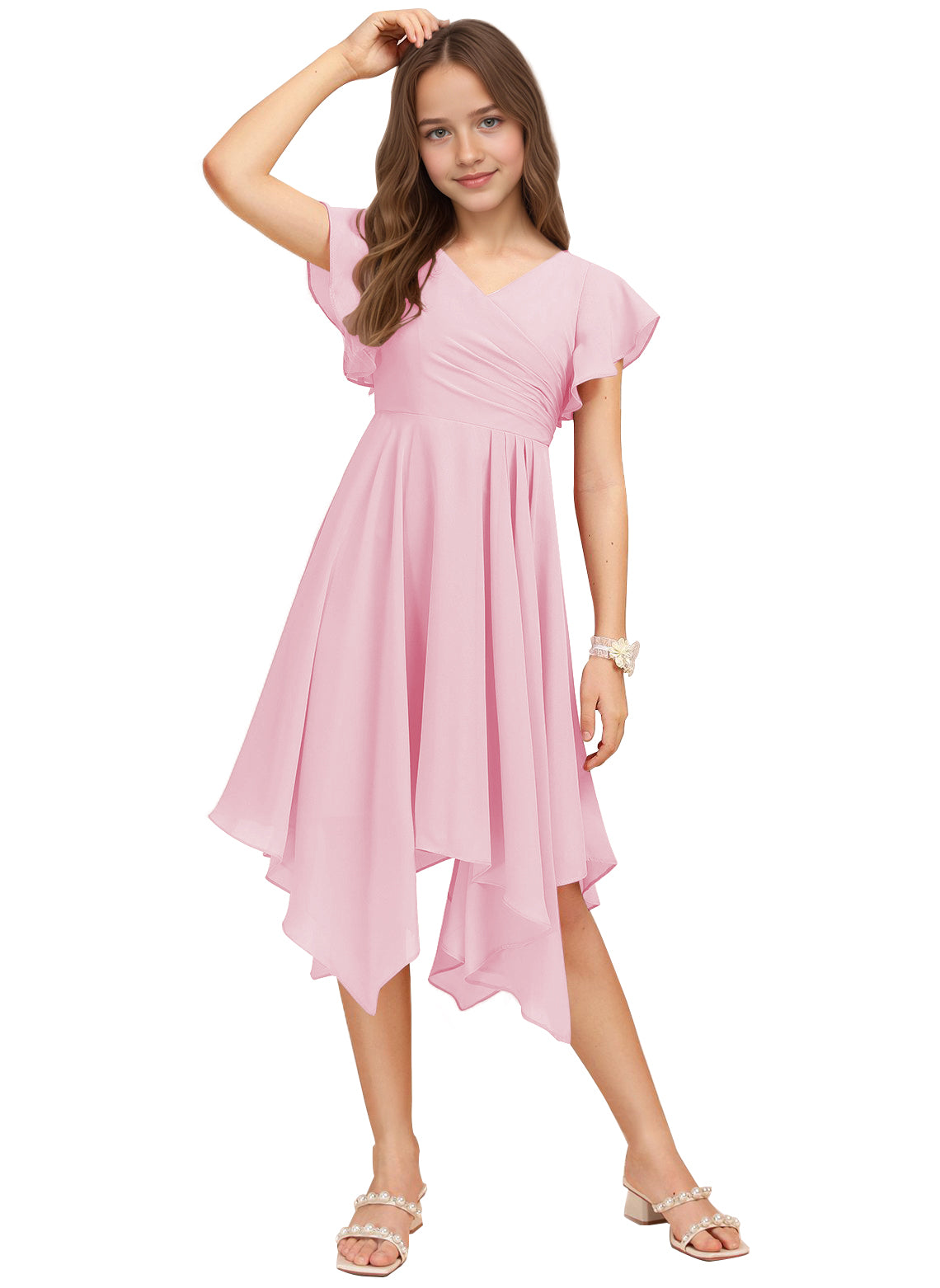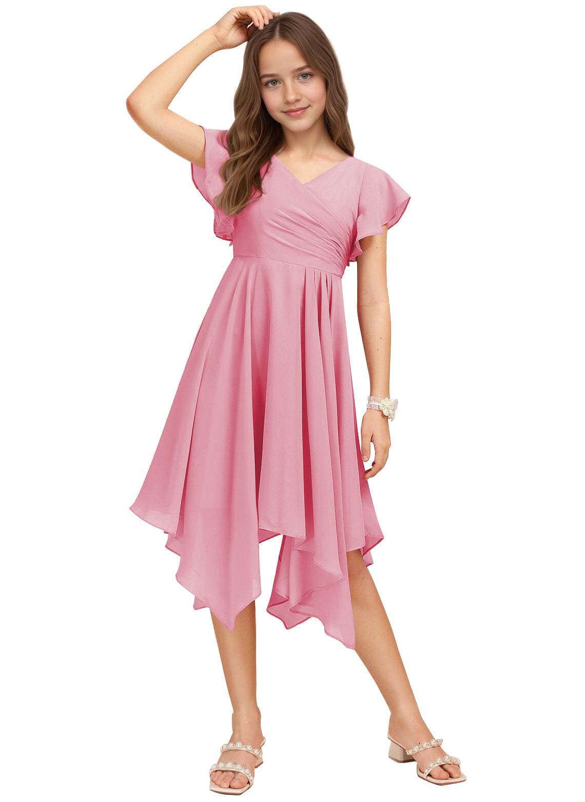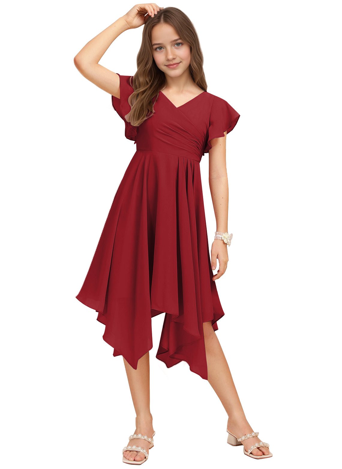 Chiffon Short Junior Bridesmaid Dresses Knee Length Flutter Sleeves Flower Girl Dresses for 4-16 2505