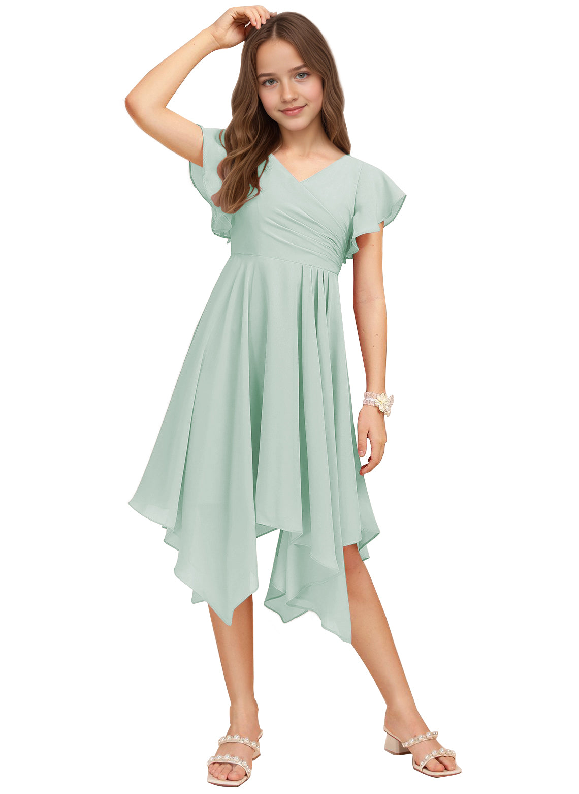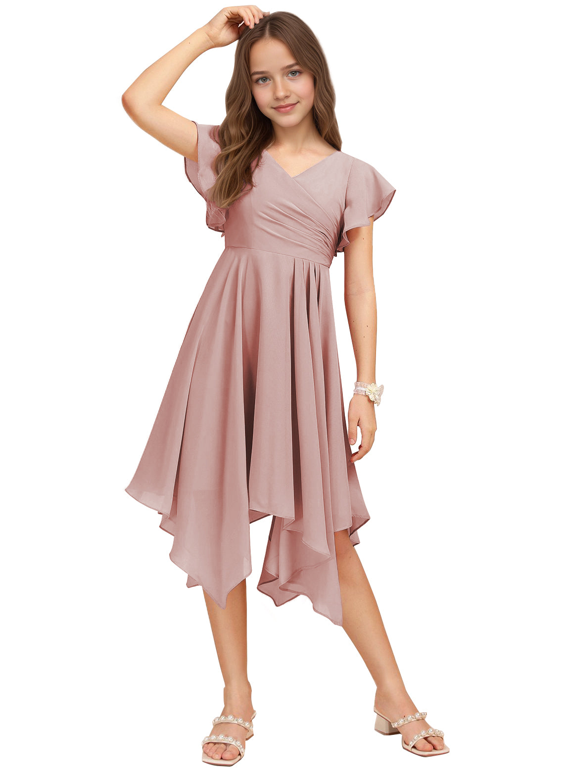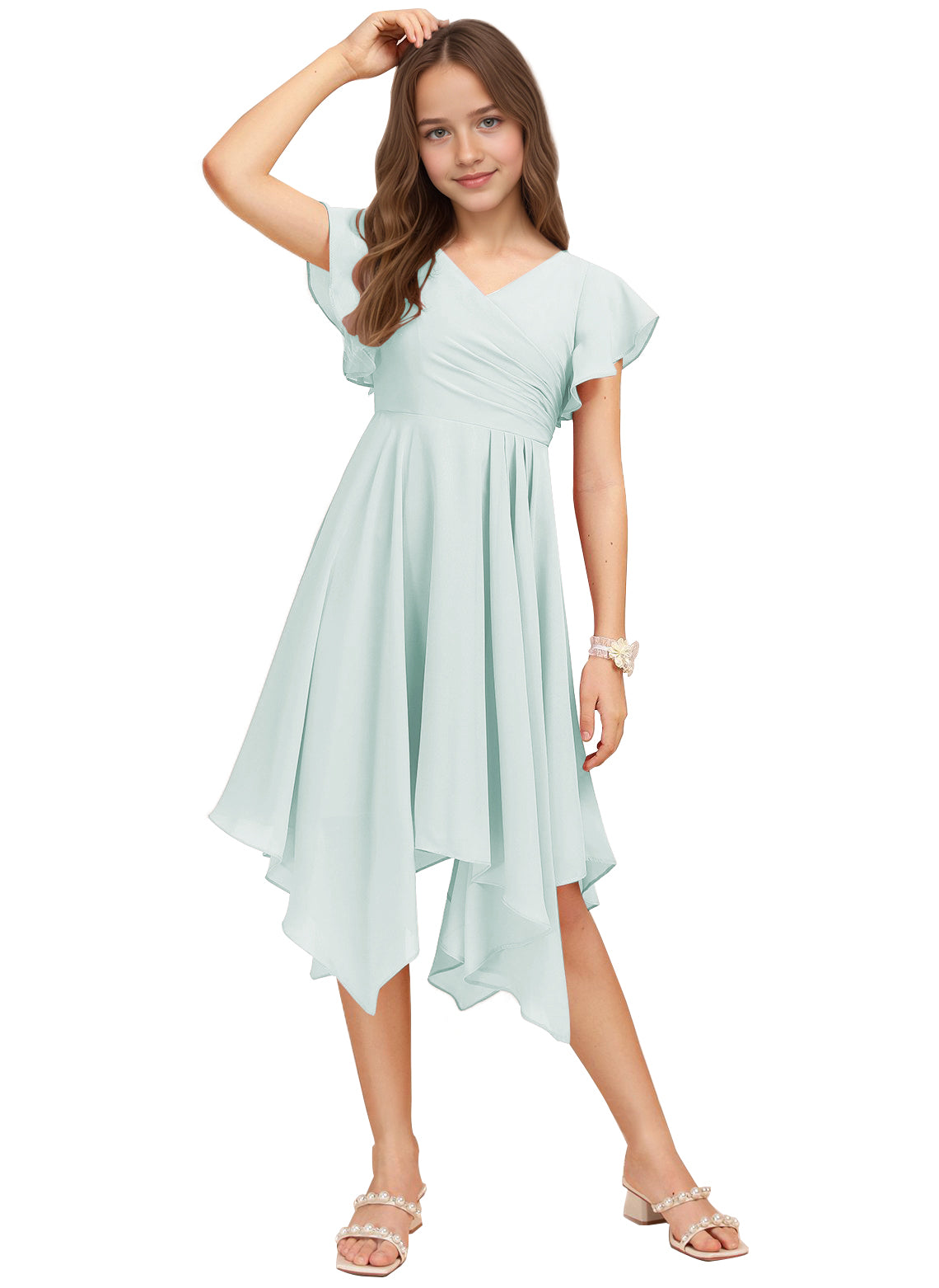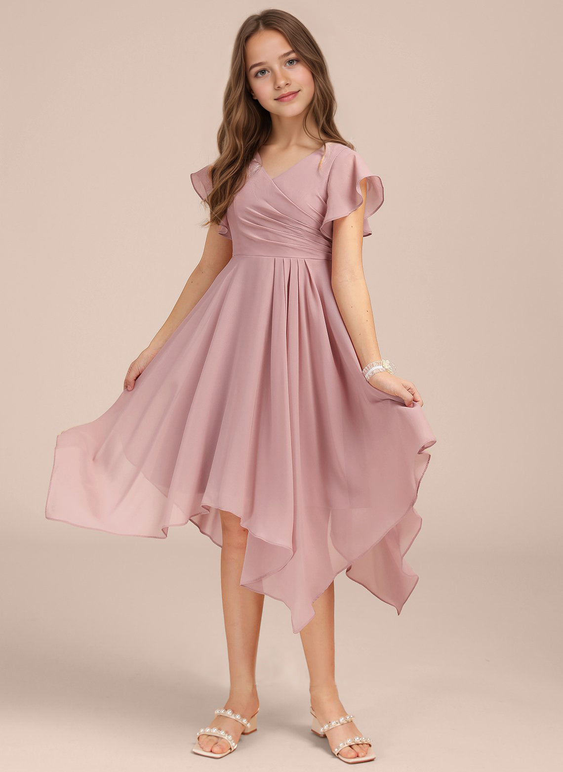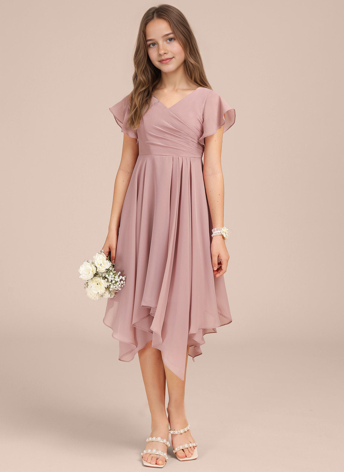 Chiffon Short Junior Bridesmaid Dresses Knee Length Flutter Sleeves Flower Girl Dresses for 4-16 2505