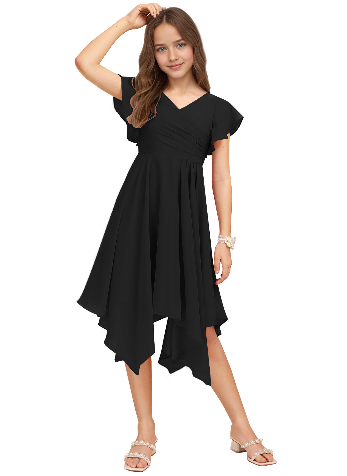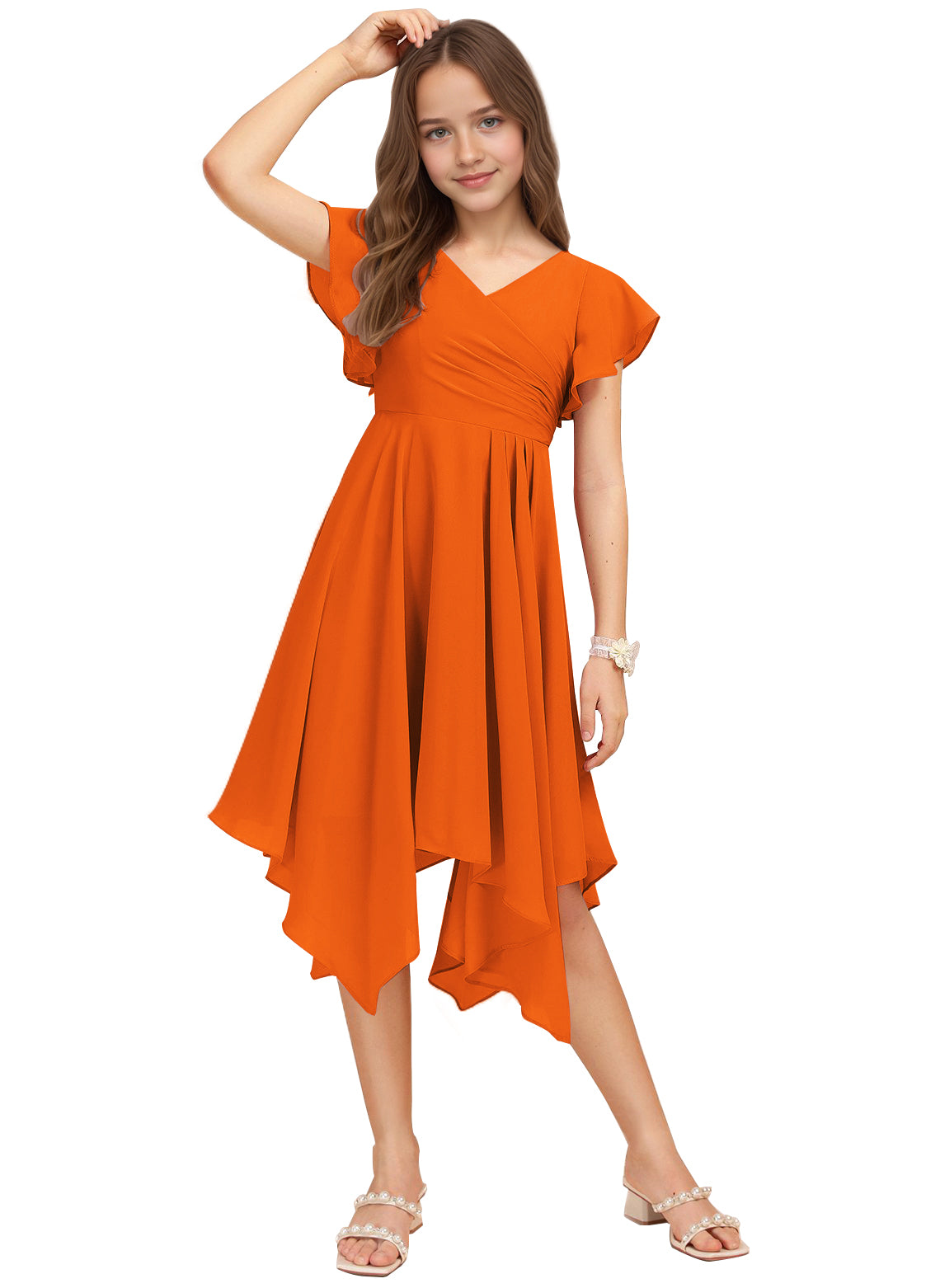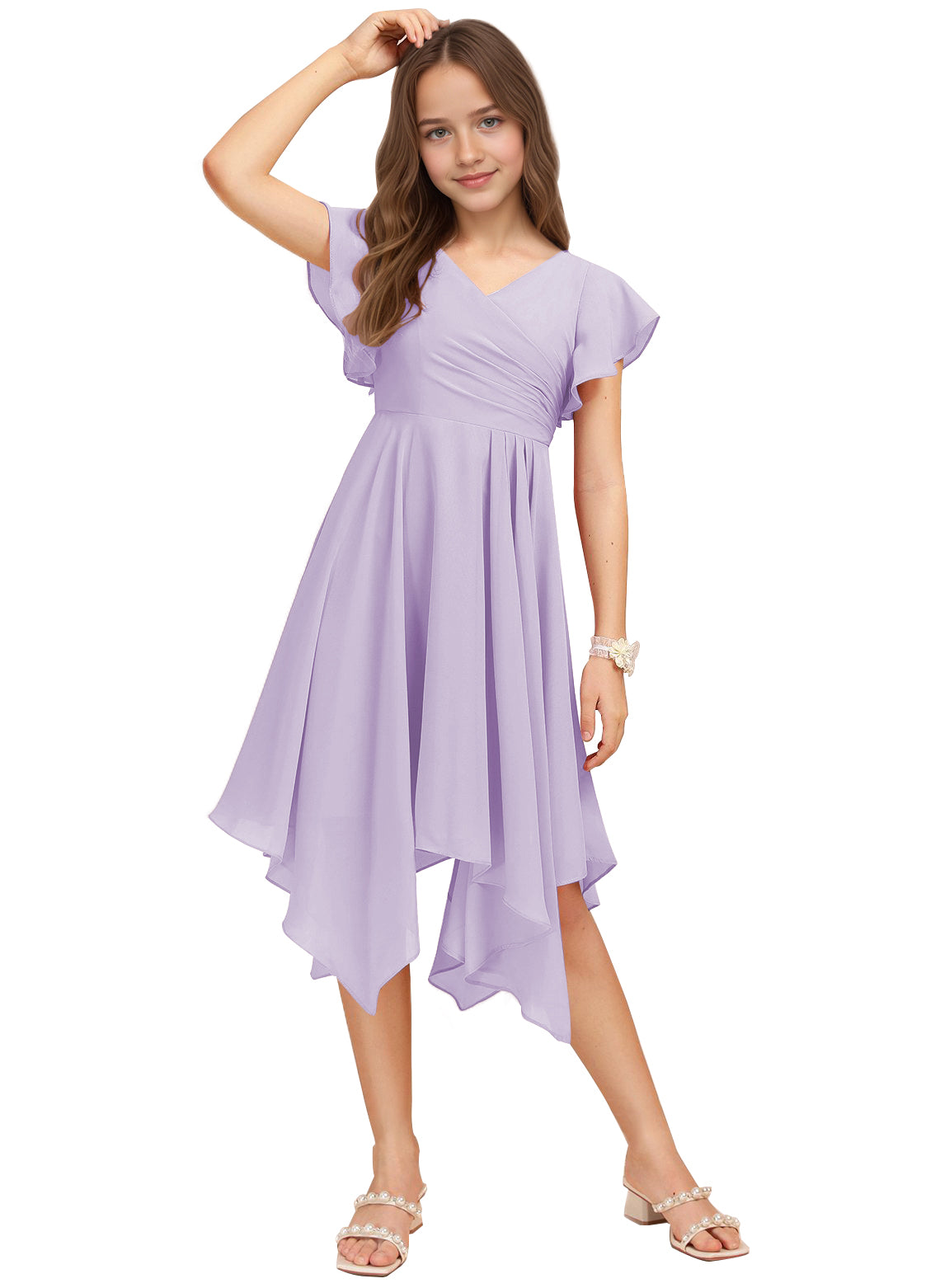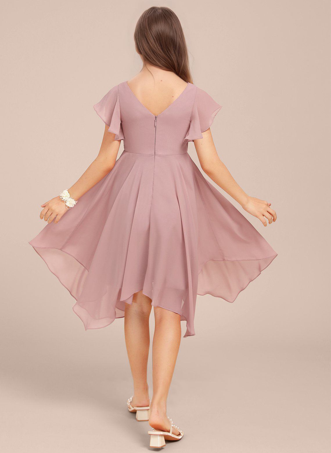 Chiffon Short Junior Bridesmaid Dresses Knee Length Flutter Sleeves Flower Girl Dresses for 4-16 2505