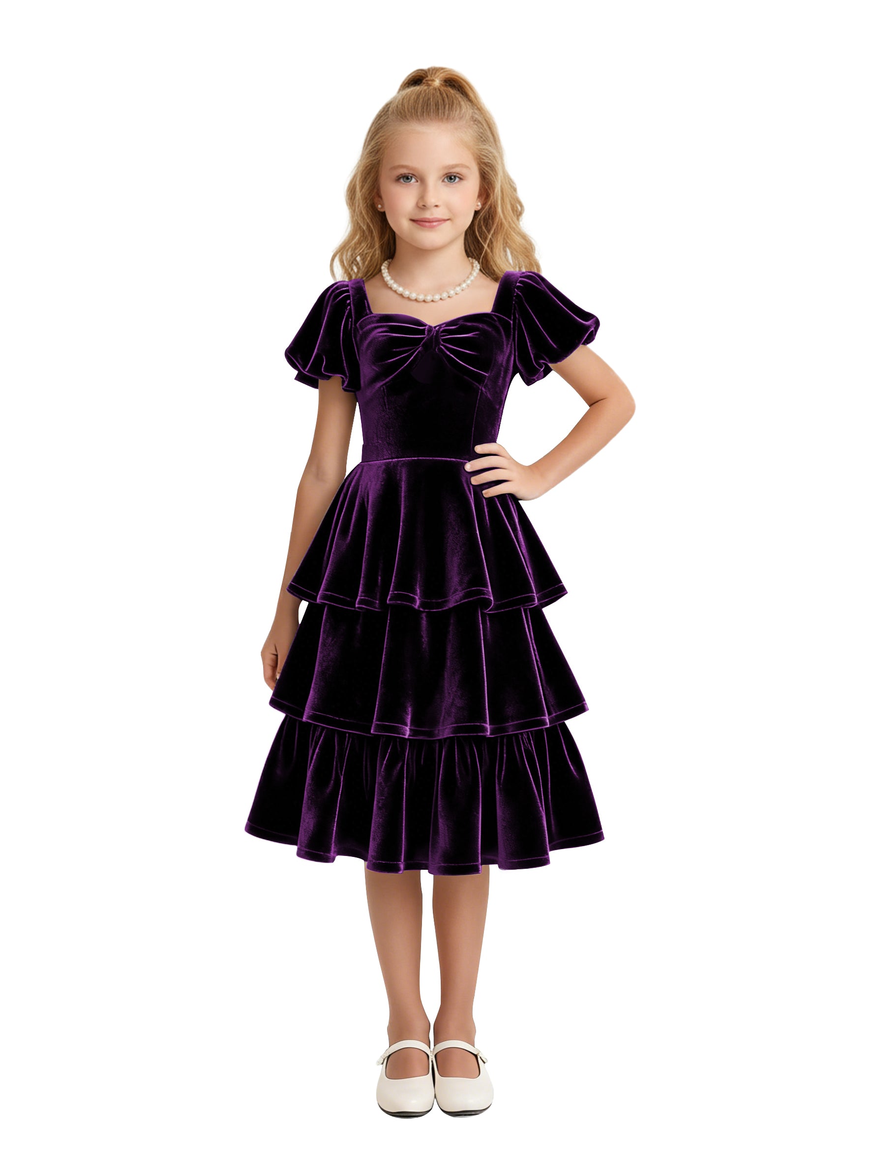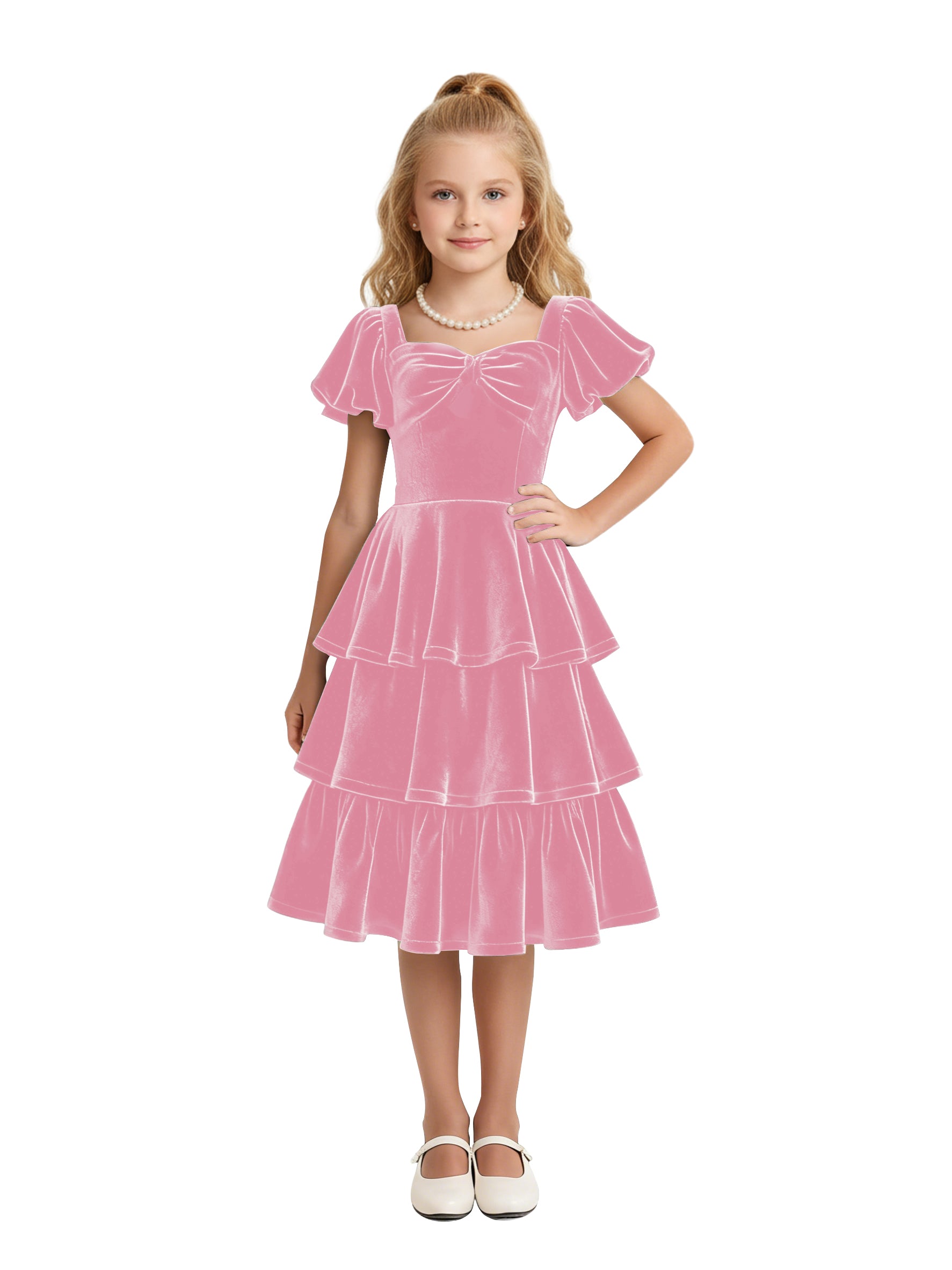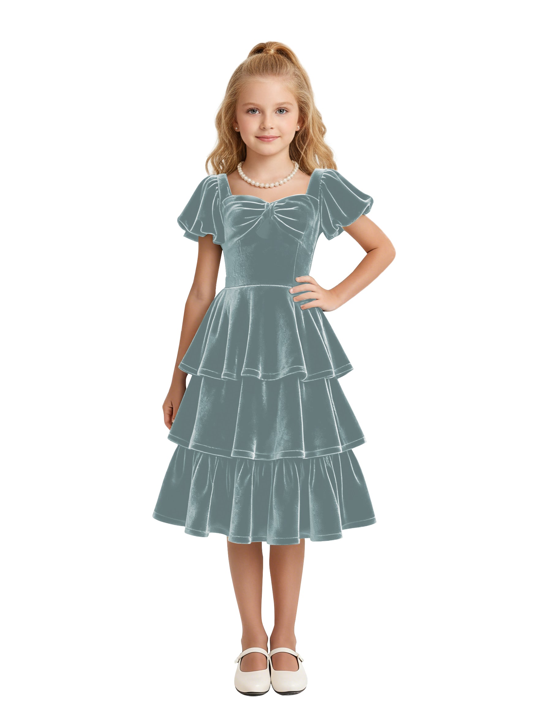dideyttawl Girls Pleated Velvet Knee Length Junior Bridesmaid Dress with Short Lantern Sleeves 2543