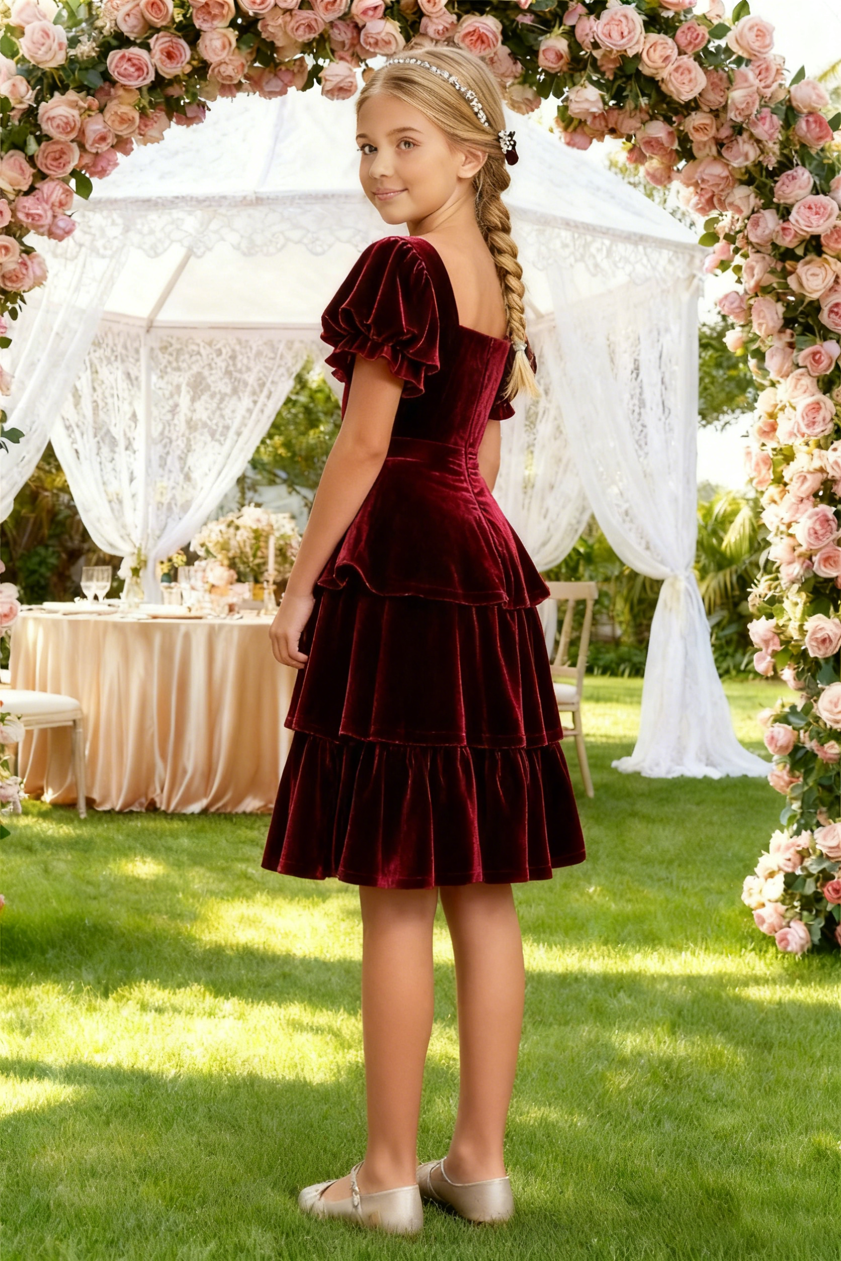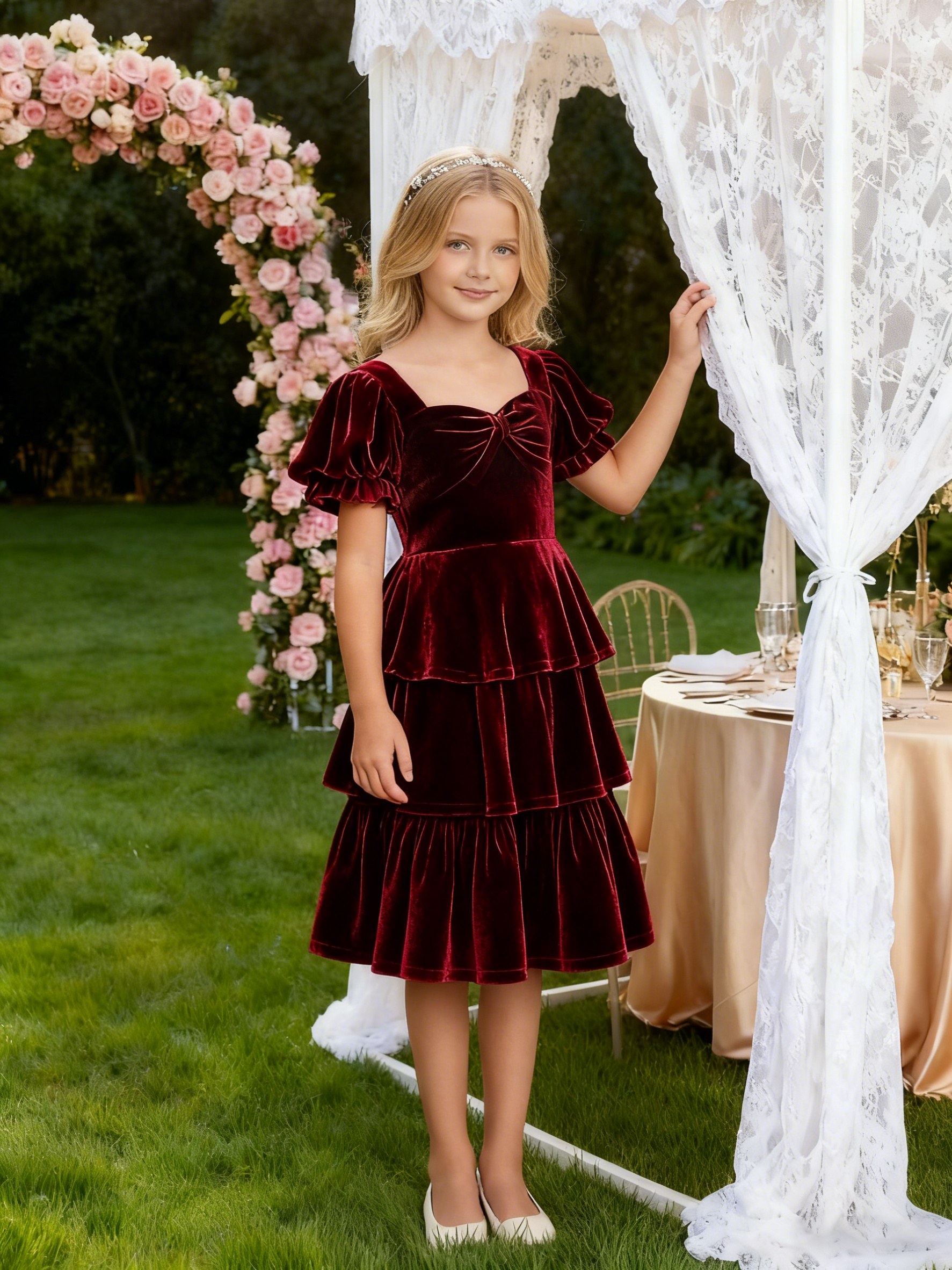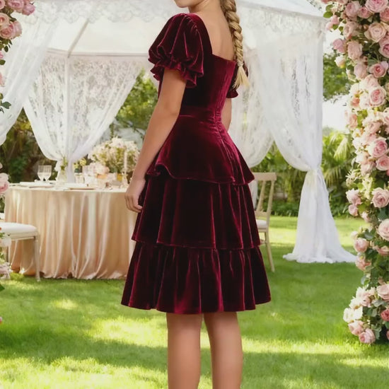 dideyttawl Girls Pleated Velvet Knee Length Junior Bridesmaid Dress with Short Lantern Sleeves 2543