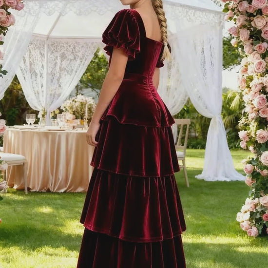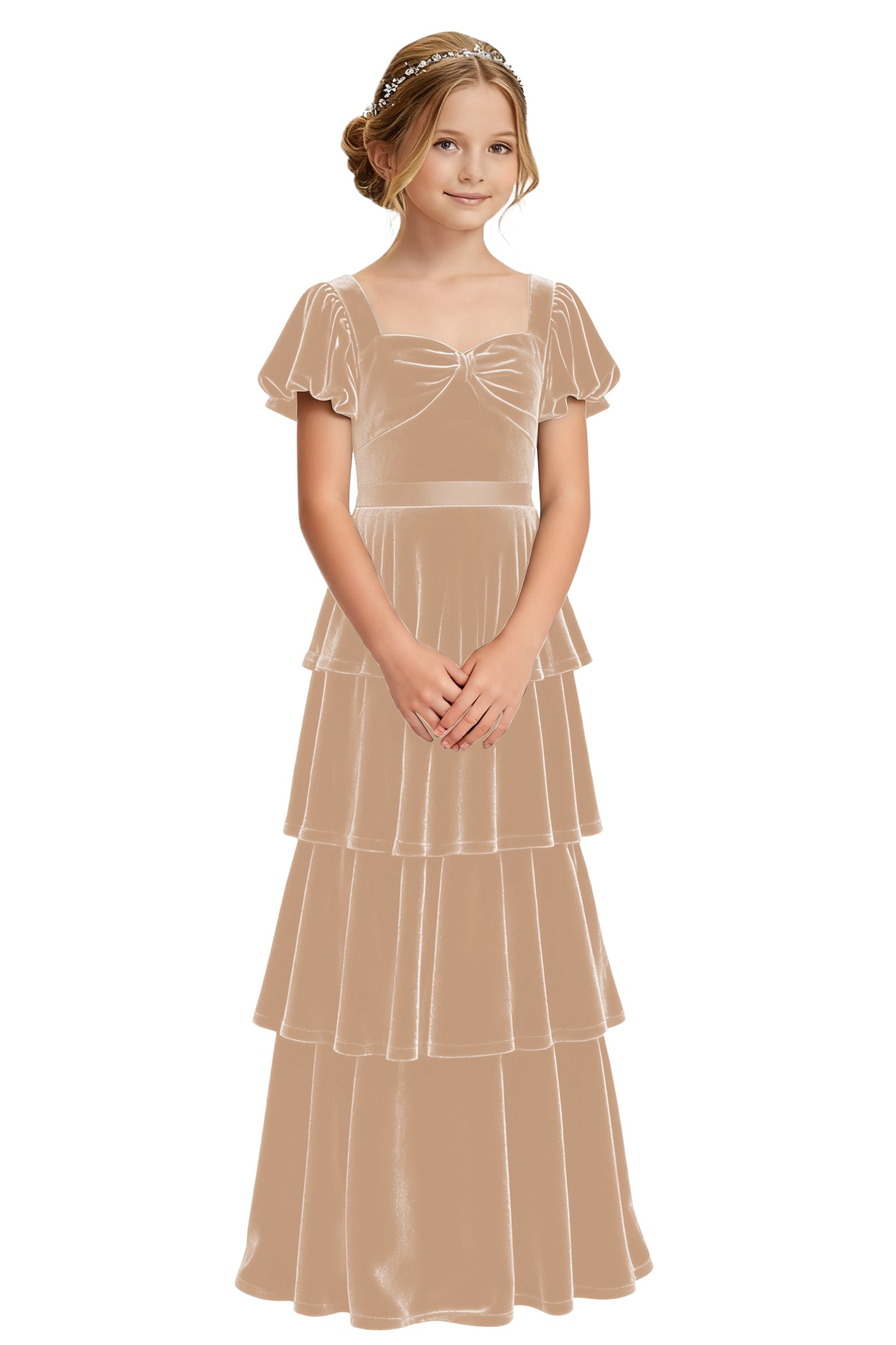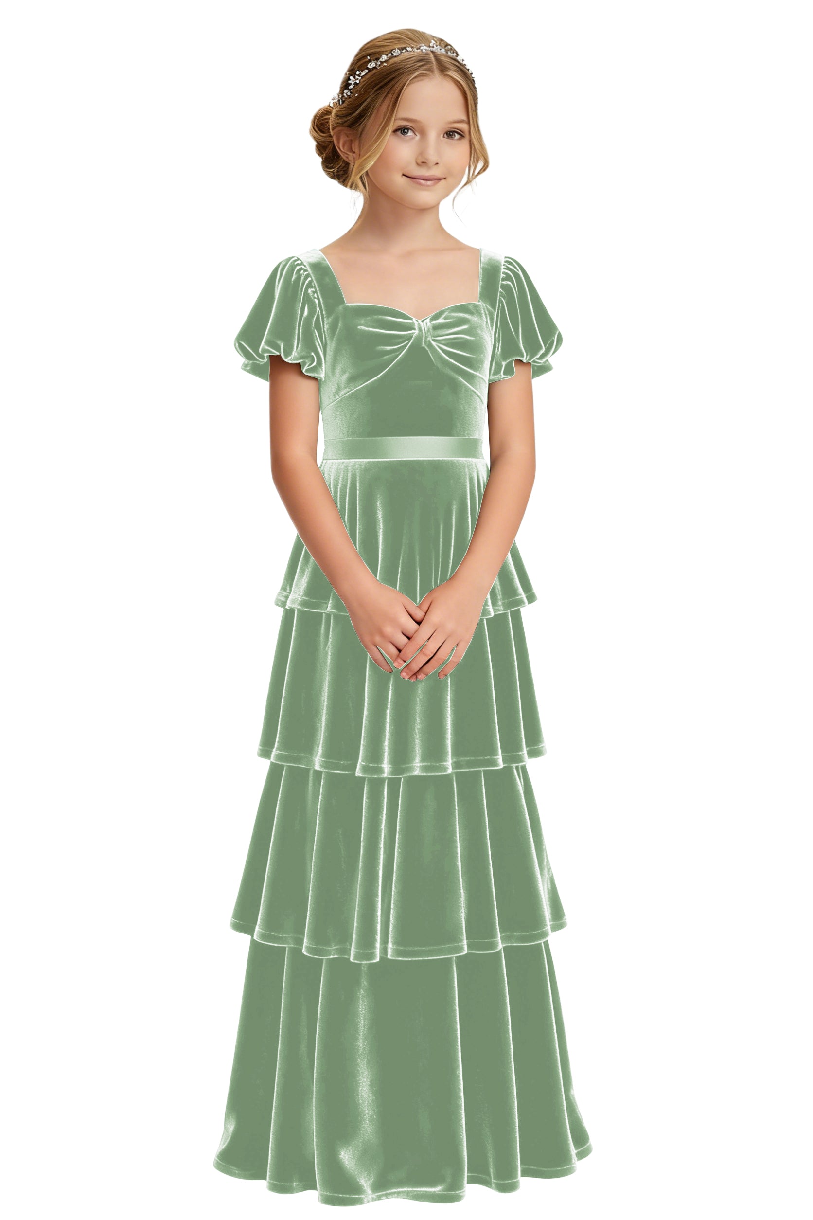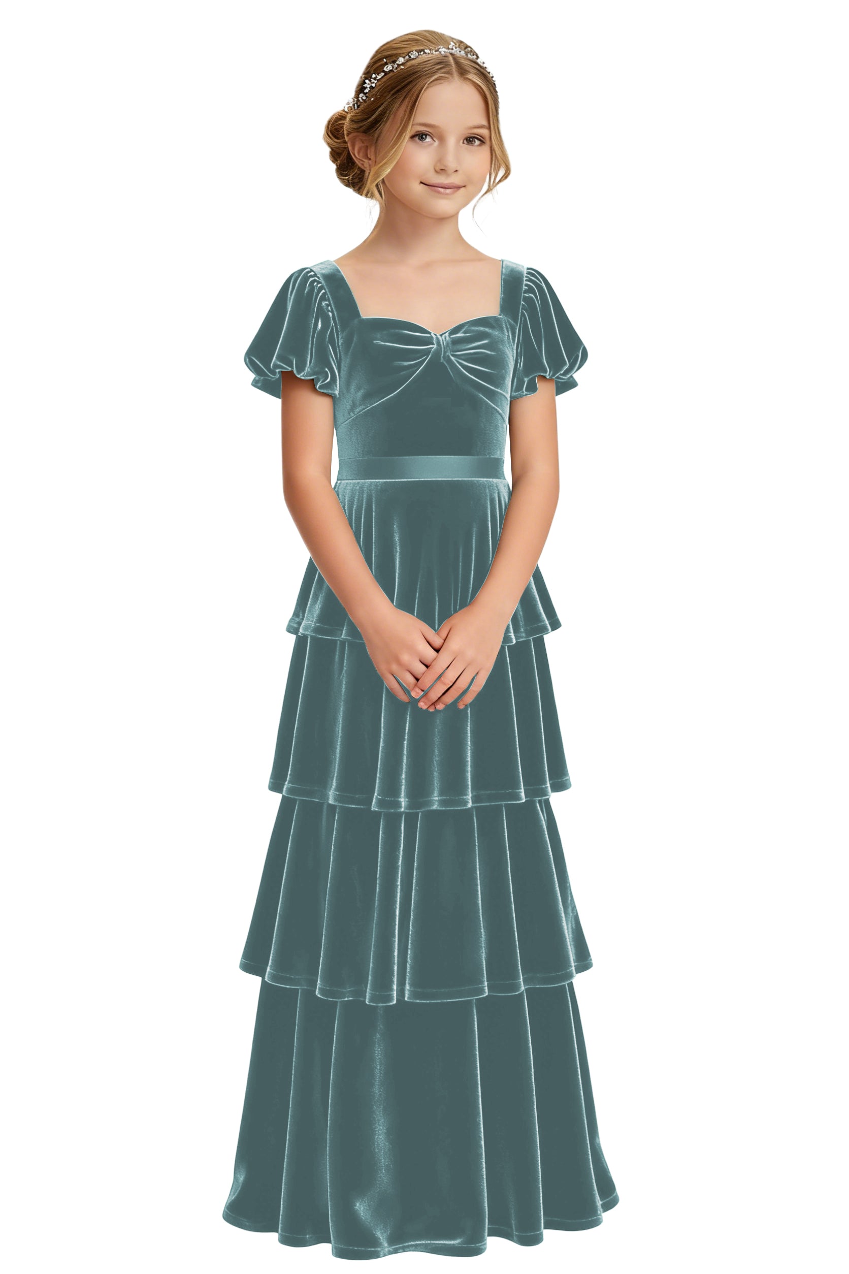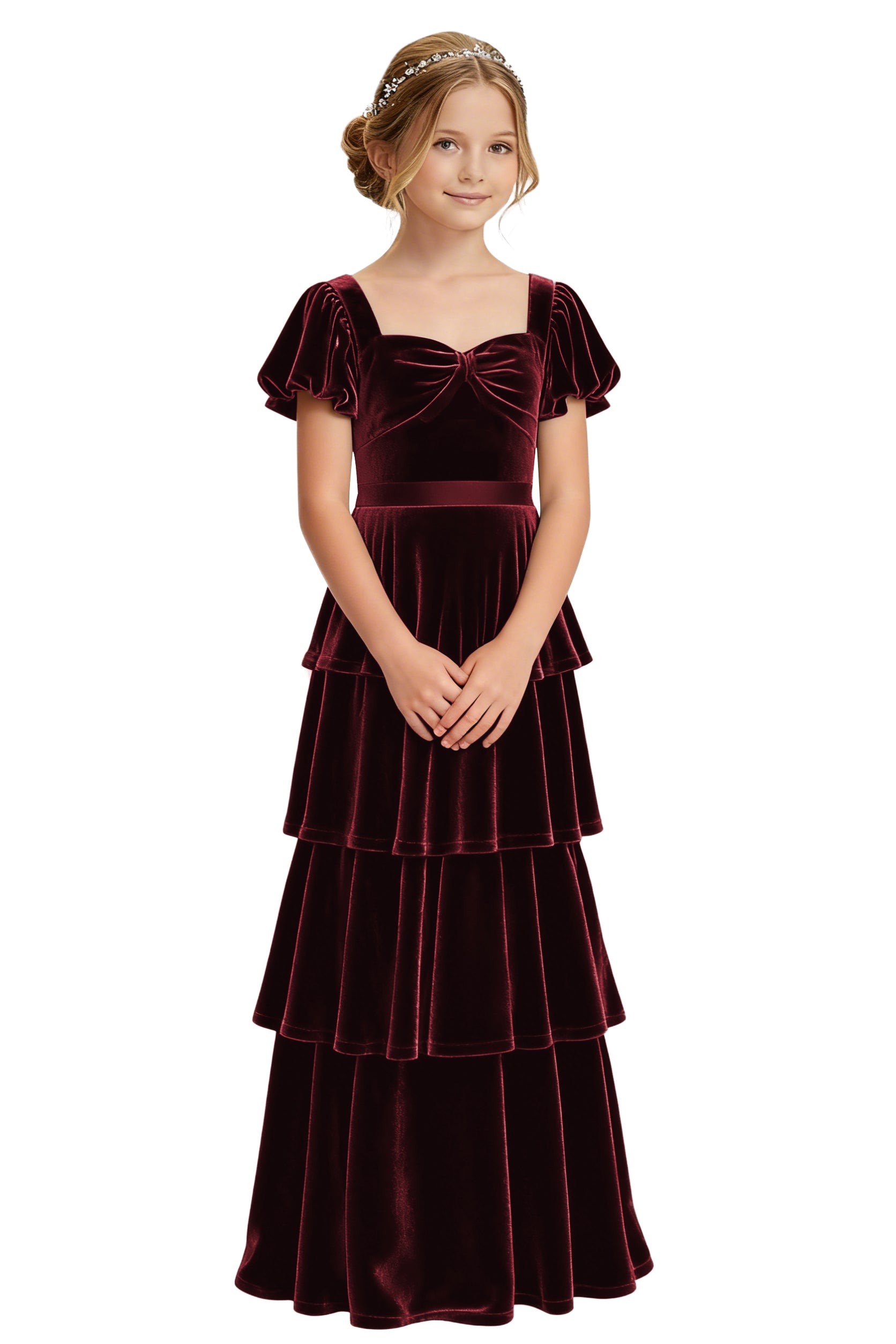 dideyttawl Girls Pleated Velvet Short Lantern Sleeves Long Junior Bridesmaid Dress 2542