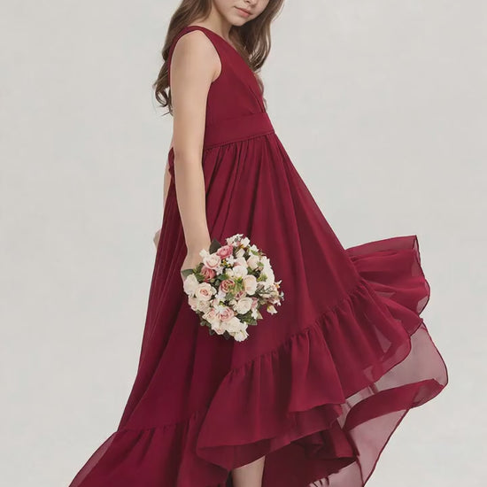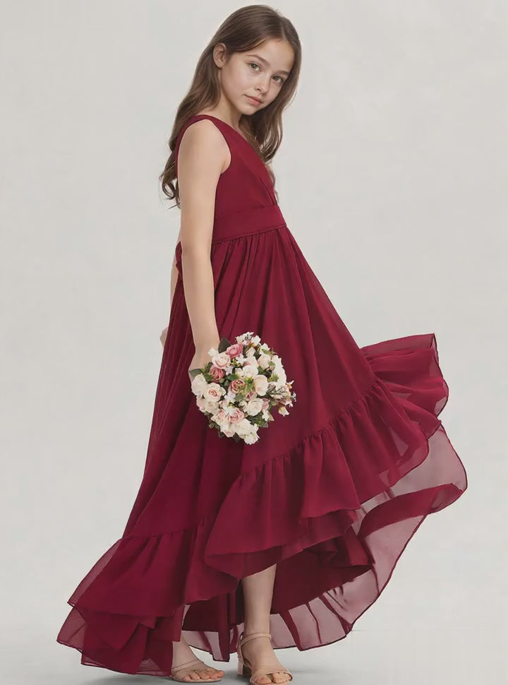 dideyttawl A-Line High Low Flower Girls Dress Long V-Neck Junior Bridesmaid Dresses for Teens Pleated Chiffon 2511