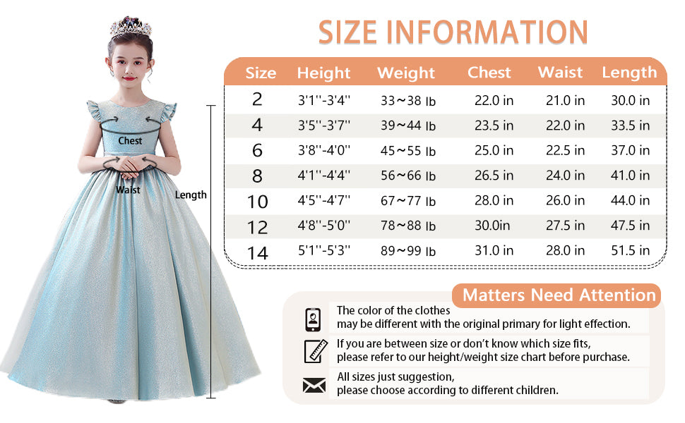 We provide customized dresses,if you are between sizes or do not know which size fits,please provide your girl's height, weight, waist and bust size to us, we can make a fitted dress for your girl.