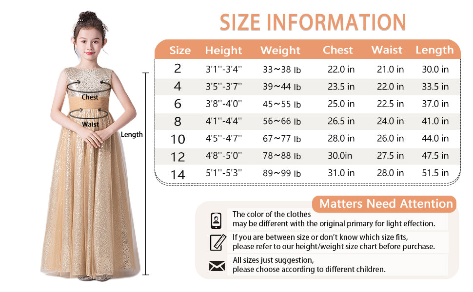 We provide customized dresses,if you are between sizes or do not know which size fits,please provide your girl's height, weight, waist and bust size to us, we can make a fitted dress for your girl.