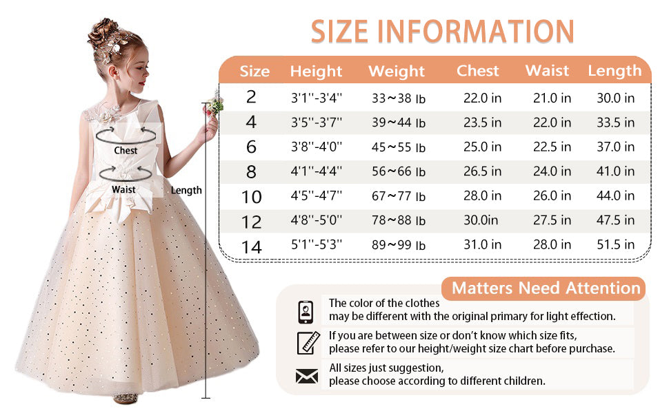 We provide customized dresses,if you are between sizes or do not know which size fits,please provide your girl's height, weight, waist and bust size to us, we can make a fitted dress for your girl.
