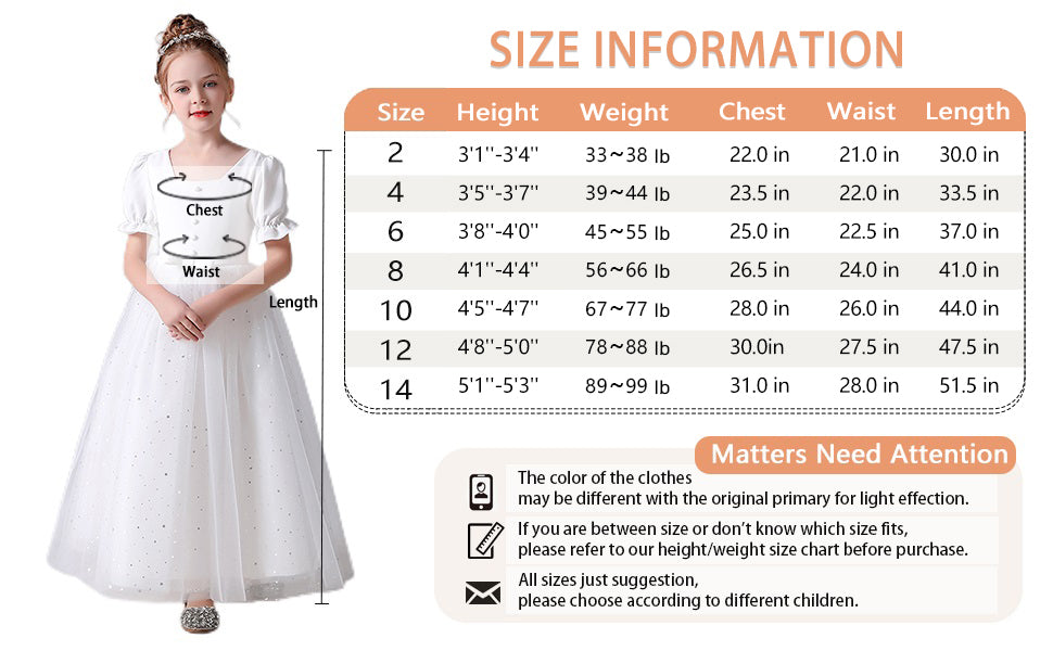 We provide customized dresses,if you are between sizes or do not know which size fits,please provide your girl's height, weight, waist and bust size to us, we can make a fitted dress for your girl.