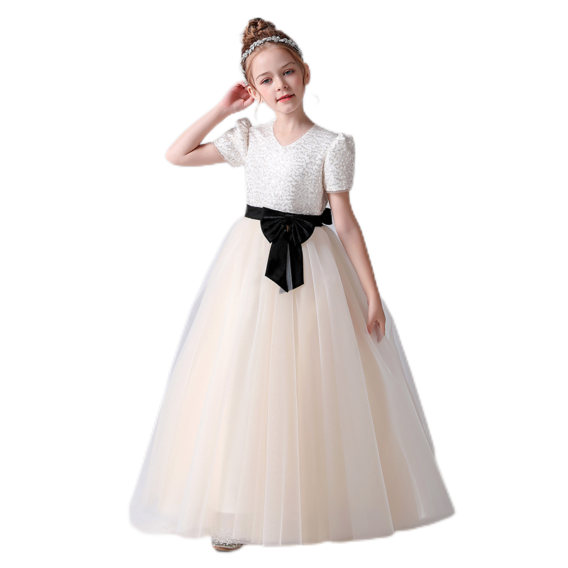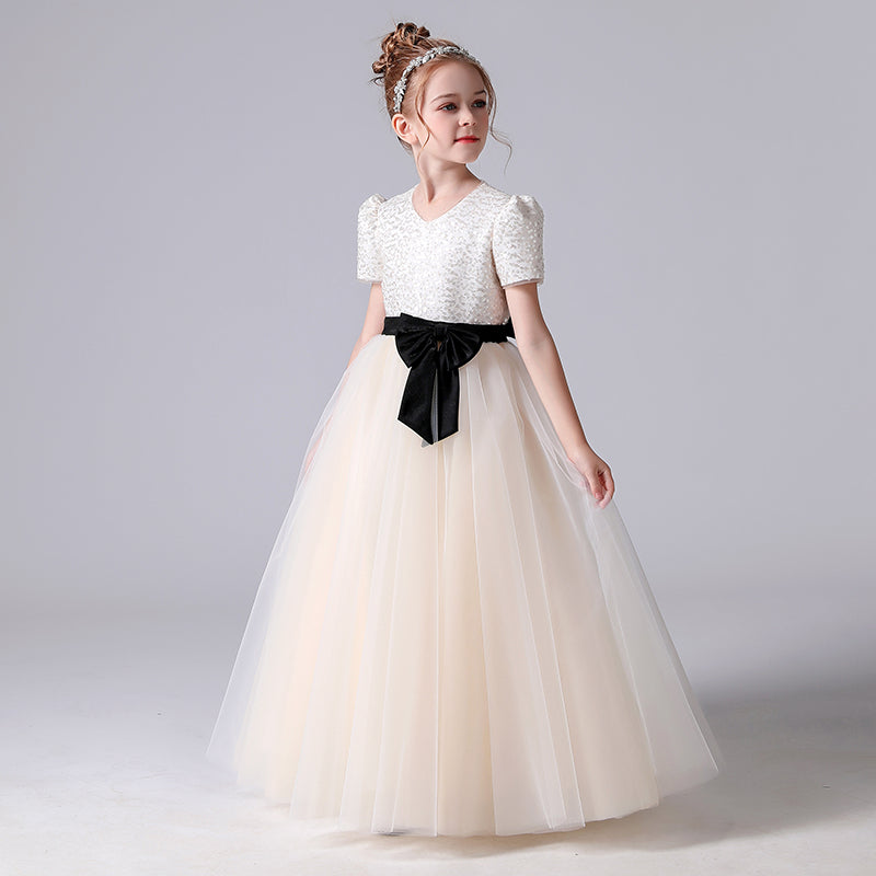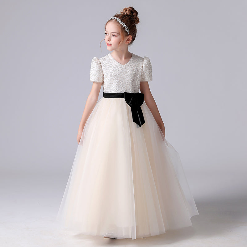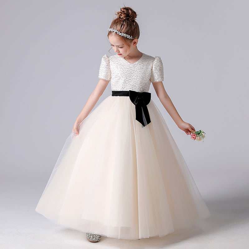 Girls First Communion Dresses V-Neck Champagne Formal Dresses For Junior Sequin Birthday Party Dresses Floor Length